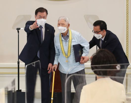 문재인 대통령은 24일 청와대에서 열린 국가유공자 및 보훈가족 50여명을 초청해 오찬을 가졌다. 문 대통령이 한국전쟁 참전 후 농촌사회 발전에 힘써온 하사용(91) 씨에게 국민훈장 동백장을 수여한 뒤 자리를 안내하고 있다. [연합] |