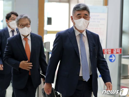 (서울=뉴스1) 황기선 기자 = 형남순 성정 회장(오른쪽)과 정재섭 이스타항공 공동관리인이 24일 오후 서울 서초구 회생법원에서 열린 '이스타항공-성정 인수합병(M&A) 투자 계약'을 위해 발걸음을 옮기고 있다. 2021.6.24/뉴스1