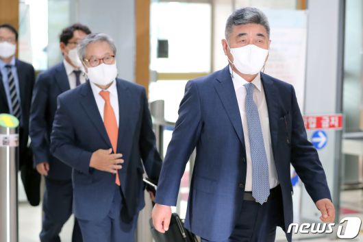 형남순 성정 회장(오른쪽)과 정재섭 이스타항공 공동관리인이 24일 오후 서울 서초구 회생법원에서 열린 '이스타항공-성정 인수합병(M&A) 투자 계약'을 위해 발걸음을 옮기고 있다. 2021.6.24/뉴스1 © News1 황기선 기자 |