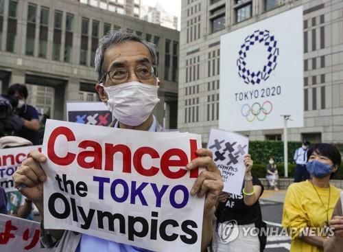(도쿄 로이터=연합뉴스) 23일 일본 도쿄도청 앞에서 도쿄올림픽 반대 시위가 열리고 있다. |