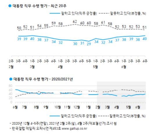 여론조사 전문기관 한국갤럽이 지난 22~24일 전국 만 18세 이상 1002명을 대상으로 6월 4주차 문 대통령의 직무 수행평가를 조사해보니, 긍정률이 40%로 전주 대비 2%포인트 상승한 것으로 나타났다. 지난 3월 1주차(40%) 이후 16주 만에 가장 높은 수준으로 반등한 것이다.