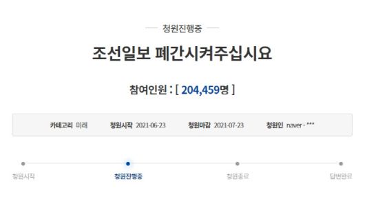 25일 청와대 국민청원 홈페이지를 보면 ‘조선일보 폐간시켜주십시오’라는 제목의 청원에는 이날 오후 4시 15분 기준 20만4459명이 동의했다. 해당 청원은 지난 23일 올랐는데, 사흘 만에 청와대 답변 기준을 충족한 것이다.