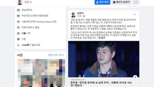 김근식(사진) 경남대 교수(전 국민의힘 비전전략실장)는 26일 자신의 페이스북에서 문재인 대통령의 아들인 문준용 씨에 대해 "대통령 아들이라는 특수지위인 만큼 더 겸손하게 묵묵히 작업만 열중하세요"라며 "제발 떠벌이 관종처럼 소란피우지 마시고요"라고 비판했다.