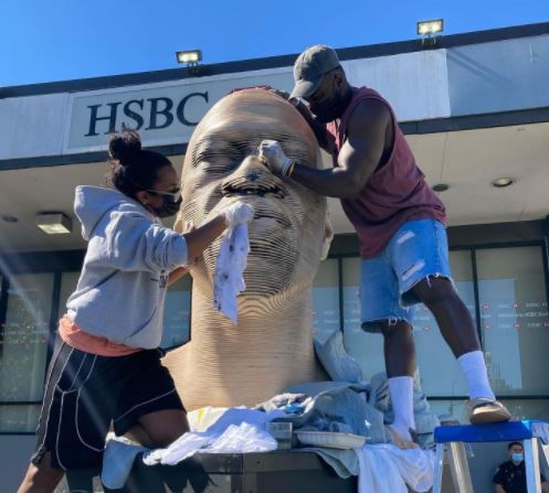 조지 플로이드 흉상에 뿌려진 검은 페인트를 지우는 비영리재단 '위 아 플로이드' 관계자들. [위 아 플로이드 페이스북 갈무리. 재판매 및 DB 금지] |