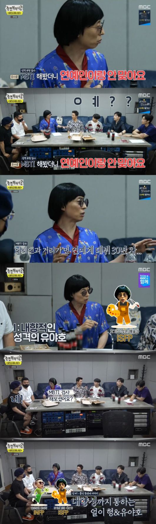 유야호는 자신의 MBTI를 언급했다. 그는 "믿으실지 모르겠지만 MBTI 해봤더니 연예인이랑 안 맞는다"며 "앞에 나서는 거 별로 안 좋아한다"고 털어놨다.