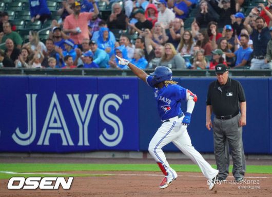 게레로 주니어는 27일(한국시간) 세일렌 필드엣 벌어진 볼티모어 오리올스와의 홈경기 3회 말 공격에서 상대 선발 키건 에이킨의 초구를 공략, 가운데 담장을 넘겼다.