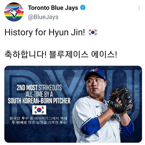 구단은 류현진의 사진과 함께 "한국인 투수 중 메이저리그에서 역대 두 번째로 많은 삼진을 기록한 투수"라는 설명을 곁들이고 태극기도 첨부했다.