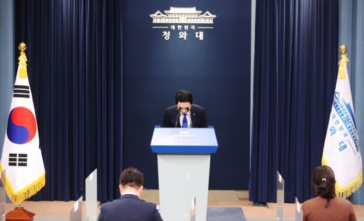 박수현 국민소통수석이 27일 청와대 춘추관에서 김기표 반부패비서관 경질과 관련한 브리핑을 마치고 고개숙여 인사하고 있다. [연합] |