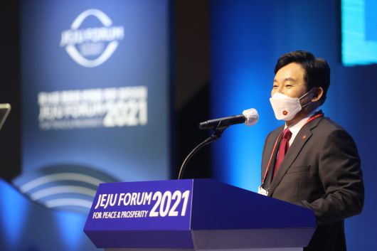 지난 26일 제주 서귀포시 표선읍 해비치 호텔 앤드 리조트에서 열린 '제16회 평화와 번영을 위한 제주포럼' 폐막식에서 원희룡 제주지사가 폐막 선언을 하고 있다./연합뉴스 |