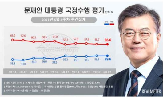 리얼미터가 YTN 의뢰로 6월4주차(21~25일) 주간 집계해 28일 발표한 결과, 문 대통령 국정수행 긍정평가(지지율)가 지난주와 같은 39.6%(매우 잘함 21.8%, 잘하는 편 17.8%)를 기록했다.