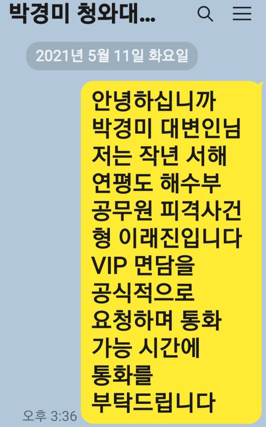 피살공무원의 친형 이래진씨는 28일 조선닷컴에 박경미 청와대 대변인에게 보낸 카카오톡 메시지를 공개했다.