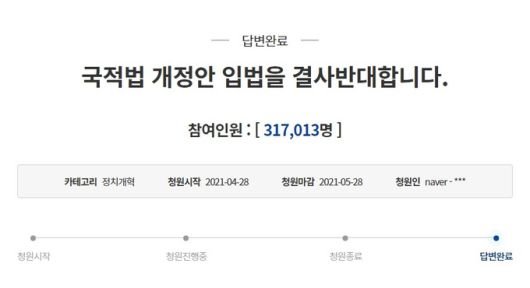 앞서 청원인은 지난 4월28일 올라온 청원글에서 “국민들은 국적법 개정안의 전면 철회를 요구하며 절대적인 반대를 표한다”고 주장했다. 이어 “국적법 개정으로 저출산과 고령화를 해결한다는 것은 터무니없는 사고에 불과하다”며 “앞으로 대한민국은 혈통주의의 전통을 통해 우리 한민족의 정체성을 보존해 나갈 것이다”라고 강조했다.