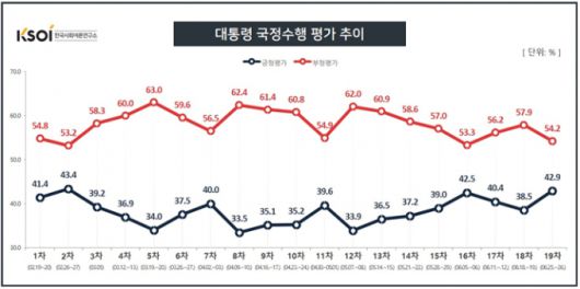한국사회여론연구소(KSOI)가 TBS 의뢰로 지난 25~26일 성인남녀 1004명을 대상으로 조사한 결과 문 대통령의 국정 수행 지지율(긍정평가)가 지난 주보다 4.4%p 오른 42.9%로 집계됐다.