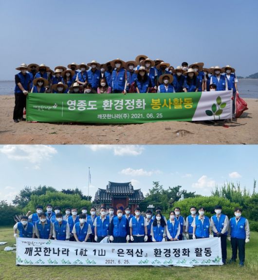 깨끗한나라 임직원이 인천 용유도 해변과 청주시 흥덕구 은적산에서 환경정화 활동을 진행했다. [사진=깨끗한나라] |