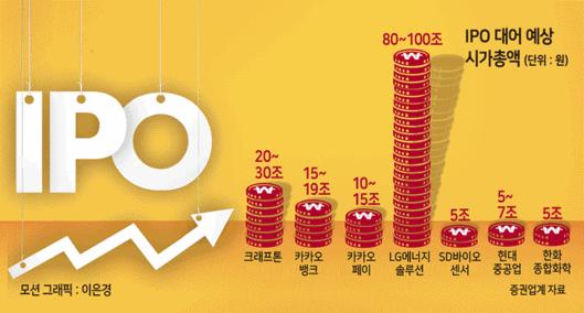 고평가 논란이 지속되는 가운데 하반기에 증시 입성을 앞둔 IPO 대어들의 시가총액만 다 합쳐도 200조원에 이를 전망이다. 지난 8일 한국거래소에 상장예비심사 신청을 낸 LG에너지솔루션의 기업가치는 무려 100조원에 달할 것이란 관측되고 있다.