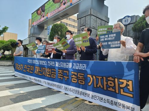 (청주=연합뉴스) 전창해 기자 = 기본소득충북네트워크, 기본소득국민운동충북본부 등은 29일 충북도청 앞에서 기자회견을 열어 "정부는 전 국민에게 재난지원금을 즉시 지급하라"고 촉구했다.
