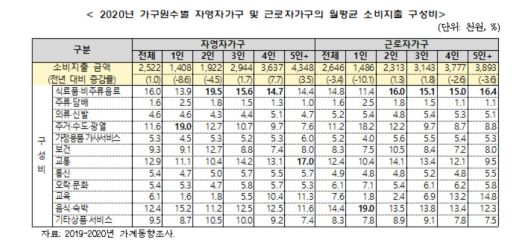 지난해 소비 항목별 비중을 연령별로 보면, 39세 이하 젊은 자영자가구와 근로자가구에서 '음식·숙박'이 모두 1위(15.1%·16.8%)였다. 반면 60세 이상 자영자·근로자 가구에서는 식료품·비주류음료의 비중이 20% 이상으로 가장 컸다. 가구원 수별로 보면 1인 가구에서 자영자 가구는 주거·수도·광열(19.0%), 음식·숙박(15.2%) 순으로, 근로자 가구는 음식·숙박(19.0%), 주거·수도·광열(18.2%) 순으로 지출이 많았다.