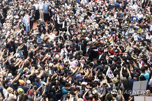 행사장에 들어가지 못하고 그 주위를 둘러싸고 있던 지지자 500여명은 윤 전 총장이 기자회견을 끝내고 나오자 "윤석열 대통령"을 외치며 일제히 몰려들었다.