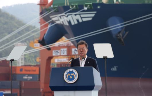 문재인 대통령이 29일 부산신항 다목적부두에서 열린 해운산업 리더국가 실현전략 선포 및 1.6만TEU급 한울호 출항식에서 발언하고 있다. (사진=연합뉴스) |