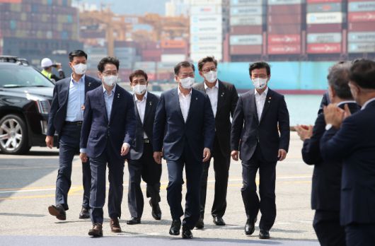 문 대통령은 이날 부산항 신항에서 열린 '해운산업 리더국가 실현전략 선포 및 1.6만TEU급 한울호 출항식'에 참석해 해운재건 성과를 점검한 뒤 이같이 밝혔다.