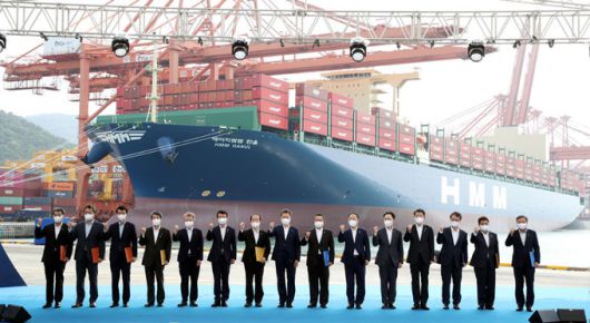문재인 대통령이 29일 부산 신항 다목적부두에서 열린 해운산업 리더국가 실현전략 선포식 및 1.6만TEU급 한울호 출항식에서 기념촬영을 하고 있다. 부산=청와대사진기자단 ⓒ 세상을 보는 눈, 세계일보
