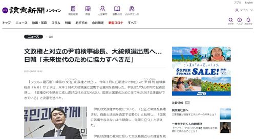 일본 최대 일간지인 요미우리신문은 '문재인 정권과 대립하다가 올 3월 임기 도중 사임한 윤 전 총장이 내년 3월 대선에 나서겠다는 의향을 표명했다'는 내용의 기사를 1면에 게재하고 6면에 별도 해설기사를 실었다.