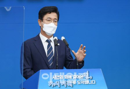 허태정 대전시장이 30일 대전시청사에 민선 7기 3주년 정례브리핑을 통해 그간의 성과에 대해 설명하고 있다.
