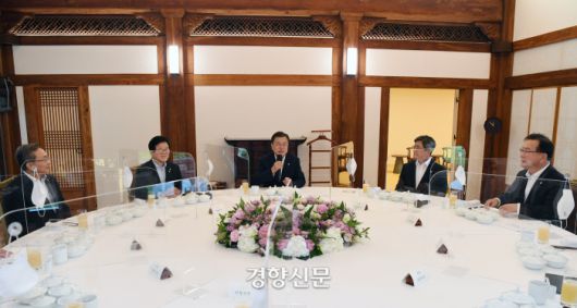 문재인 대통령이 30일 청와대 상춘재에서 열린 헌법기관장 초청 오찬에서 환담을 나누고 있다. 왼쪽부터 유남석 헌법재판소장, 박병석 국회의장, 문 대통령, 김명수 대법원장, 김부겸 국무총리. 청와대사진기자단 |