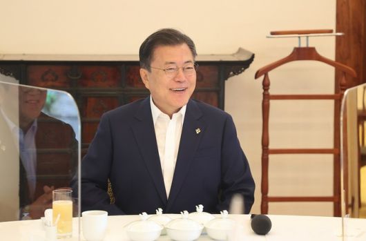 문재인 대통령이 30일 청와대 상춘재에서 열린 헌법기관장 초청 오찬간담회에서 참석자들과 환담하고 있다. 사진 왼쪽부터 유남석 헌법재판소장, 박병석 국회의장, 문 대통령, 김명수 대법원장, 김부겸 국무총리. 연합뉴스 |