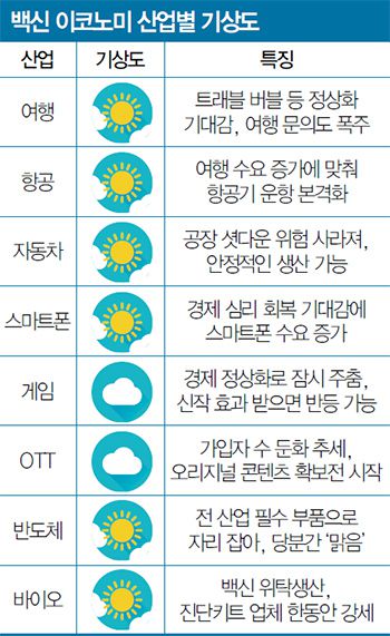 백신 접종이 본격화하며 경제 정상화에 대한 기대가 점차 높아지고 있다. 여행·항공·유통 업계 등 코로나19 직격탄을 맞은 서비스 업종은 모처럼 활기를 띠는 중이다. 공장 ‘셧다운’으로 생산에 차질을 빚었던 자동차, 스마트폰 업종도 안도의 한숨을 내쉰다. 긍정적인 전망만 존재하는 것은 아니다. 백신 수급이 불안정한 데다 ‘델타 변이’ ‘백신 접종 속도’ 등 변수가 여전히 많다.
