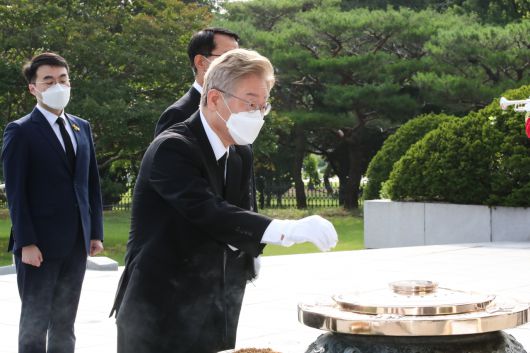 대선 출마를 선언한 이재명 경기지사가 1일 서울 동작구 국립서울현충원에서 현충탑을 참배하고 있다. 연합뉴스 |