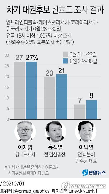 엠브레인퍼블릭·케이스탯리서치·코리아리서치·한국리서치가 지난달 28∼30일 전국 18세 이상 1천7명에 '차기 대통령감으로 누가 가장 적합한가'를 물은 결과, 이 지사는 전주와 같은 27%, 윤 전 총장은 1%포인트 오른 21%의 지지도를 각각 기록했다.