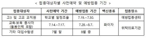 이 밖에 7∼9월 징집병, 모집병, 부사관 후보생 등 입영 예정자 약 7만명을 대상으로 한 접종도 12일부터 시행된다. 이들은 화이자 백신을 접종받을 예정이다. 대상자는 관할 보건소에 입영통지서 등을 제시하고 접종 일정을 예약한 뒤 예방접종센터에서 백신을 맞을 수 있다.
