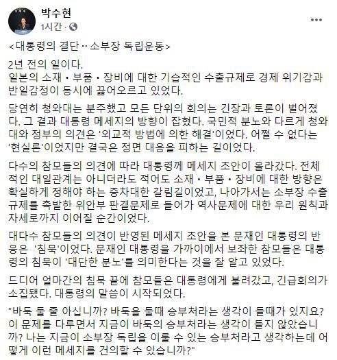 박 수석이 이날 페이스북에 올린 글에 따르면 지난 2018년 7월 소재·부품·장비(소부장)에 대한 일본의 수출규제가 있자, 청와대는 긴박한 토론 끝에 문재인 대통령에게 보고할 메시지를 마련했다.