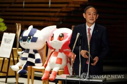 스가 요시히데(菅義偉) 일본 총리가 일본 총리관저에서 약식 기자회견을 하는 가운데 뒤쪽에 올림픽 마스코트 인형이 놓여 있다. [로이터=연합뉴스 자료사진] |