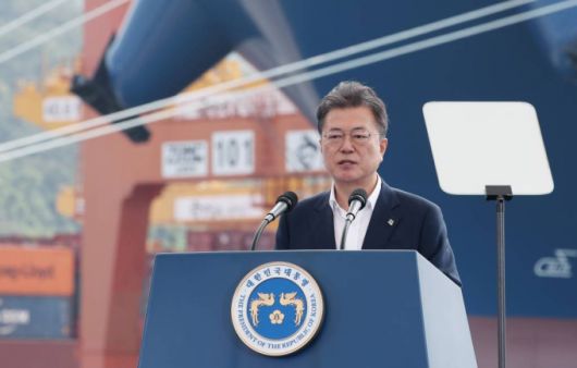 [서울=뉴시스]김진아 기자 = 문재인 대통령이 29일 부산신항 다목적부두에서 열린 해운산업 리더국가 실현전략 선포 및 1.6만TEU급 한울호 출항식에서 발언하고 있다. 2021.06.29. bluesoda@newsis.com |