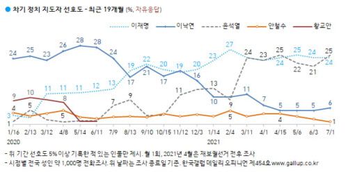 한국갤럽이 지난달 29일부터 3일간 전국 만 18세 이상 1000명을 대상으로 차기 지도자 선호도를 물은 결과, 윤 전 총장이 25%, 이 지사가 24%의 지지율을 각각 나타냈다. 이번 조사의 오차범위는 95% 신뢰수준에 ±3.1%포인트다.