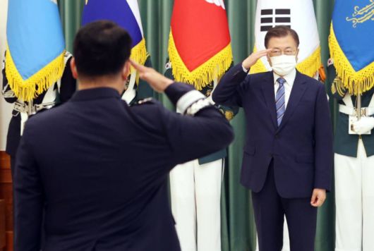 [서울=뉴시스김진아 기자 = 문재인 대통령이 2일 청와대 본관 충무실에서 열린 박인호 공군참모총장 진급 및 보직 신고식에서 거수경례하고 있다. 2021.07.02. bluesoda@newsis.com |