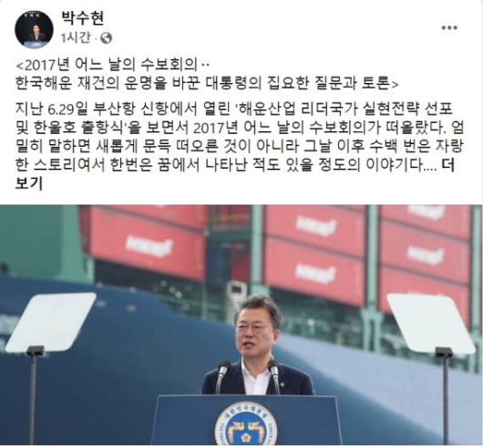 박수현 국민소통수석은 2일 자신의 페이스북에 올린 '2017년 어느 날의 수보회의-한국해운 재건의 운명을 바꾼 대통령의 집요한 질문과 토론'이라는 제목의 글을 통해 "지난 6.29일 부산항 신항에서 열린 '해운산업 리더국가 실현전략 선포 및 한울호 출항식'을 보면서 2017년 어느 날의 수보회의가 떠올랐다"고 회상했다. 박 수석은 당시 청와대 대변인이었다.