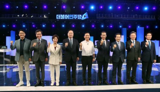 [서울=뉴시스]국회사진기자단 = 더불어민주당 대선 경선 예비후보들이 3일 오후 서울 여의도 KBS에서 열린 첫 합동 토론회에 앞서 기념촬영을 하고 있다. 왼쪽부터 박용진, 이낙연, 추미애, 김두관, 이광재, 최문순, 정세균, 이재명, 양승조 후보. 2021.07.03. photo@newsis.com |