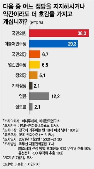 정당 지지도에서는 국민의힘 36%, 민주당 29.3%를 기록했다. 국민의힘이 오차범위 밖에서 민주당을 6.7%p 앞섰다. 이어 국민의당 6.7%, 열린민주당 6.5%, 정의당 5.1%로 집계됐다. '없음' 응답은 12.2%다.