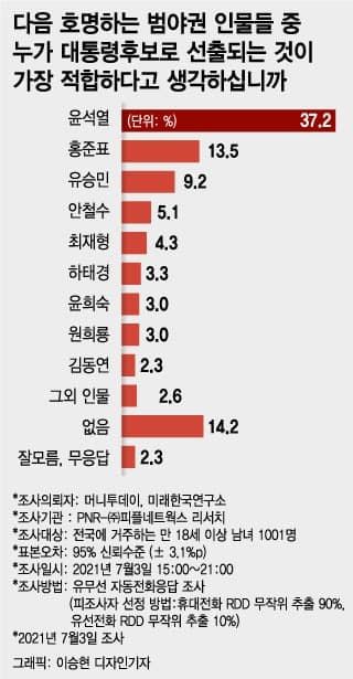 4일 머니투데이 더300[the300]과 미래한국연구소 의뢰로 여론조사업체 PNR리서치가 지난 3일 전국 성인 1001명을 대상으로 조사한 범야권 대선후보 적합도 조사에 따르면 윤 전 총장은 37.2%로 집계됐다.