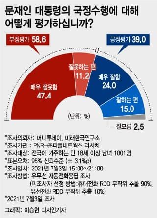 문재인 대통령의 국정수행 평가는 긍정 39%(잘하는 편 15%, 매우 잘함 24%), 부정 58.6%(잘못하는 편 11.2%, 매우 잘못함 47.4%)로 나타났다. 부정평가는 서울(64.4%), 강원·제주(64.4%), 만 60세 이상(67.4%), 만 18세~20대(65.6%), 국민의힘 지지층(94.7%)에서 높았다.
