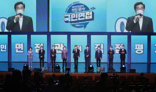 더불어민주당 9명의 대선 후보들이 4일 오후 충북 청주시 CJB컨벤션센터에서 열린 ‘대통령 취업준비생의 현장 집중면접’에서 참석자들에게 인사를 하고 있다. 왼쪽부터(기호순) 추미애, 이광재, 이재명, 정세균, 이낙연, 박용진, 양승조, 최문순, 김두관 후보. 이날 국민면접 행사는 블라인드 형식으로 진행한다 (사진=뉴스1) |
