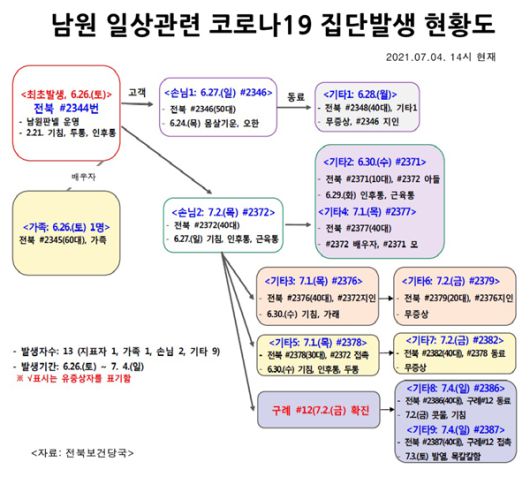 전주 나머지 확진자 1명과 남원 추가 확진자 1명은 전남 구례 12번 확진자와 접촉해 연쇄 감염된 것으로 추정됐다. 특히 남원지역 확진자는 남원시청 소속 공무원으로, 지역 내 한 음식점에서 구례 12번 확진자와 동선이 겹쳤던 것으로 알려졌다.