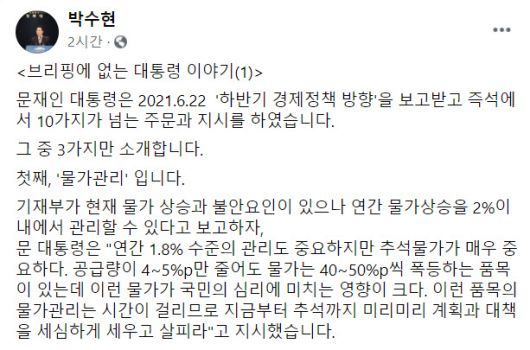 박 수석은 이날 오후 페이스북에 ‘브리핑에 없는 대통령 이야기(1)’라는 제목의 글을 게재하고 이처럼 소개했다. 박 수석은 이번을 시작으로 ‘브리핑에 없는 대통령 이야기’ 시리즈를 연재하겠다고 알렸다.