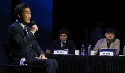 이낙연 더불어민주당 대선 후보가 4일 오후 충북 청주시 CJB컨벤션센터에러 열린 '대통령 취업준비생의 현장 집중면접'에서 1대 3 집중면접을 하고 있다. 사진=뉴스1 |