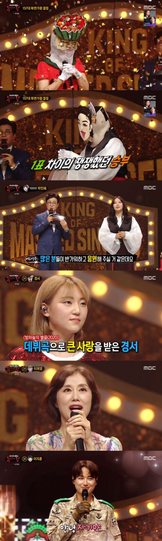 [조이뉴스24 김지영 기자] '복면가왕'에서 '화채'가 '소리꾼'을 꺾고 157대 가왕으로 등극했다.