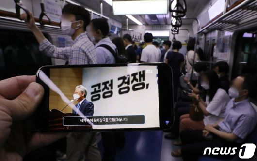 지난 1일 오전 한 시민이 지하철 1호선 안에서 더불어민주당 대선 주자인 이재명 경기지사의 제20대 대통령 선거 출마선언 라이브 방송을 스마트폰으로 시청하고 있다. 2021.7.1/뉴스1 © News1 김진환 기자 |