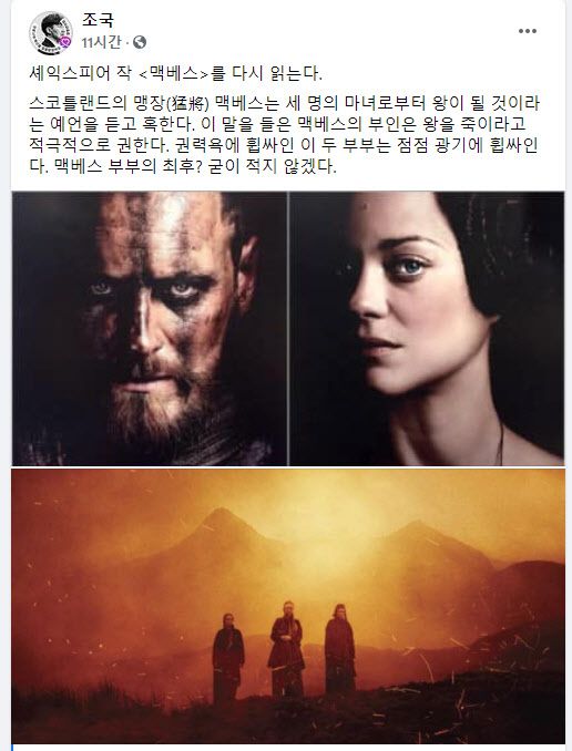 조 전 장관은 지난 4일 자신의 페이스북에 “셰익스피어 작 맥베스를 다시 읽는다”라고 말문을 열면서 이같이 밝혔다.